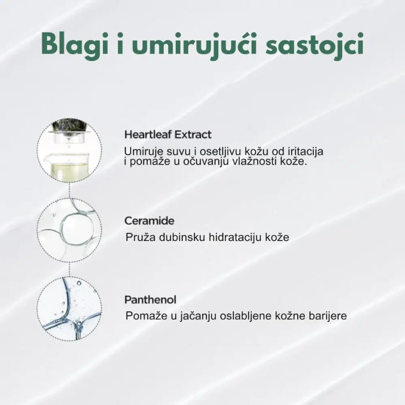 Ključni sastojak kreme je 70% ekstrakta biljke Heartleaf (Houttuynia Cordata), poznate po svojim snažnim umirujućim i antiinflamatornim svojstvima. Ovaj sastojak pomaže u smanjenju crvenila, iritacija i osećaja nelagodnosti, dok istovremeno doprinosi očuvanju optimalnog nivoa vlažnosti kože. Heartleaf je naročito cenjen u korejskoj kozmetici zbog svoje sposobnosti da balansira kožu i smanji preosetljivost.
