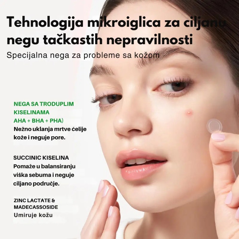 Za razliku od klasičnih flastera za bubuljice, Microdart sistem koristi sitne, topive mikroiglice koje se nežno rastvaraju u kontaktu sa kožom, oslobađajući aktivne sastojke unutar same nepravilnosti. Ova tehnologija omogućava precizno i efikasno delovanje bez oštećivanja okolne kože.