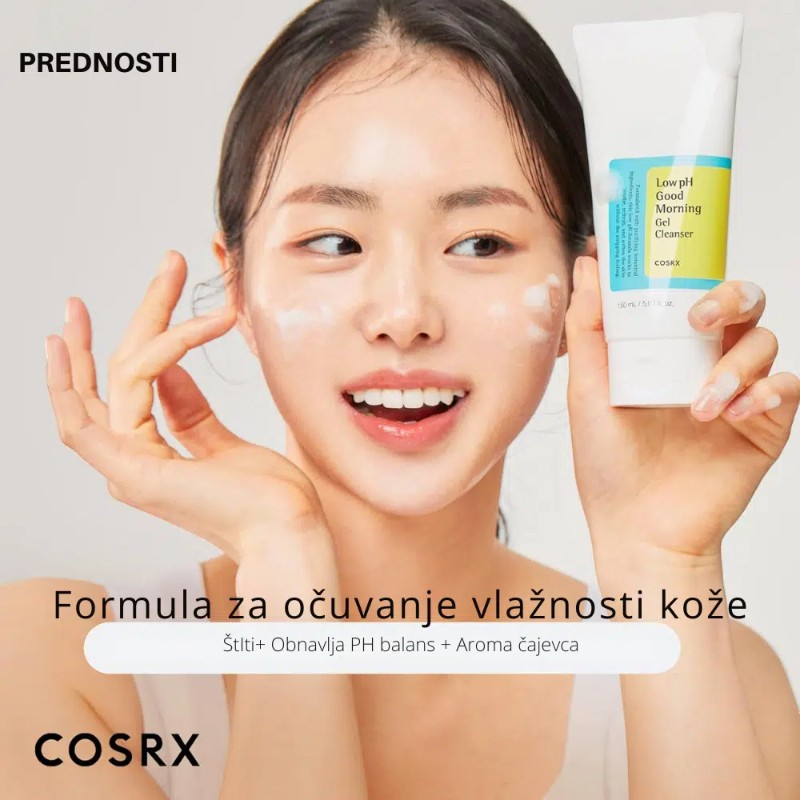 COSRX Low pH Good Morning Gel Cleanser 150ml je nežni gel za čišćenje lica razvijen sa ciljem da očuva prirodni pH balans kože i pruži efikasno, ali blago uklanjanje nečistoća. Sa niskim pH nivoom sličnim prirodnom pH kože, ovaj čistač pomaže u održavanju zdrave hidrolipidne barijere i sprečava osećaj zatezanja i isušivanja nakon umivanja.