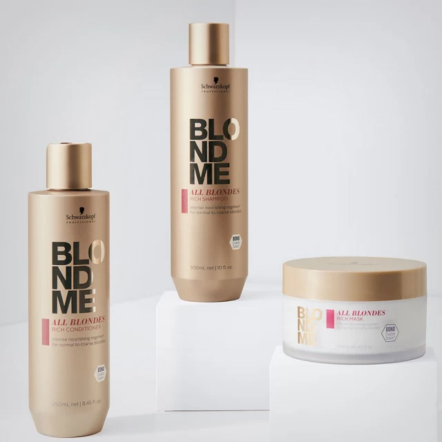 Obogaćen je 3D Bond Creation tehnologijom i proteinima kašmira, koji zajedno obnavljaju i štite kosu, čineći je otpornijom, glatkijom i lakšom za oblikovanje. BLONDME Rich Shampoo je posebno dizajniran za kosu kojoj je potrebna dodatna hidratacija, elastičnost i zaštita.